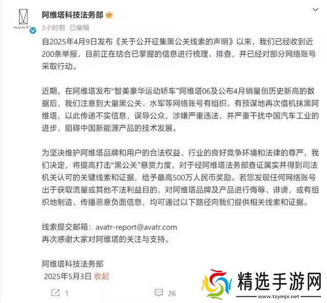 为了维护品牌形象和合法权益,阿维塔科技法务部随后宣布将加大对“黑公关”的打击力度。他们表示,对于经查证属实并得到司法机关认可的关键线索和证据,将给予最高500万人民币的奖励。这一举措旨在鼓励公众积极举报不实信息,共同维护一个健康的网络环境。