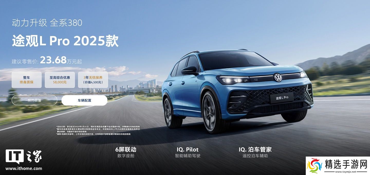 本站 5 月 6 日消息,上汽大众旗下 2025 款途观 L Pro车型现已上市,系列车型主要升级 380TSI 高功率动力,配置方面新增遥控泊车辅助功能,官方指导价为 23.68 万元起,不过官方表示系列车型“限时最高综合优惠为 5.8 万元”。