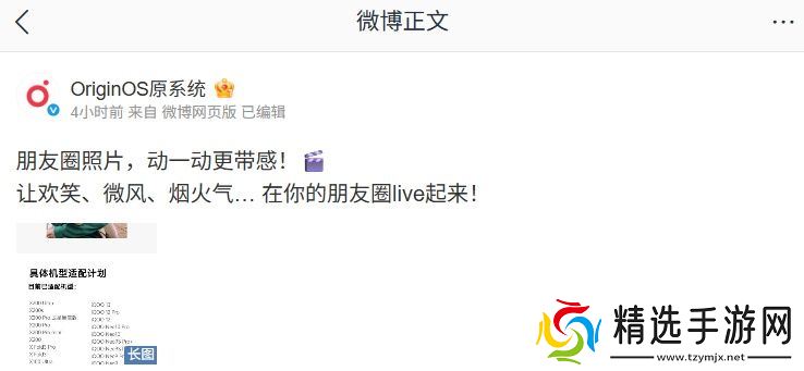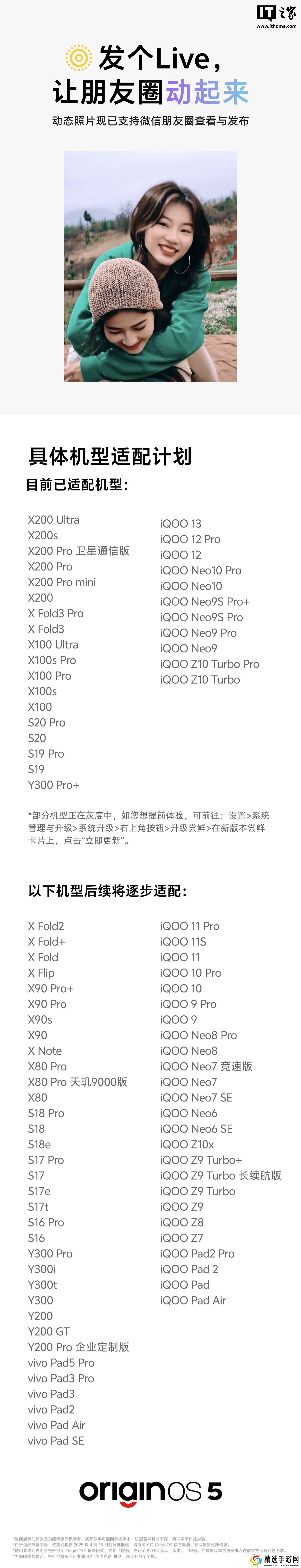 本站 5 月 6 日消息,vivo 手机操作系统官方微博@OriginOS原系统 今日公布了微信朋友圈 Live 图适配机型,含 vivo X200 系列、iQOO 13/12 等机型。