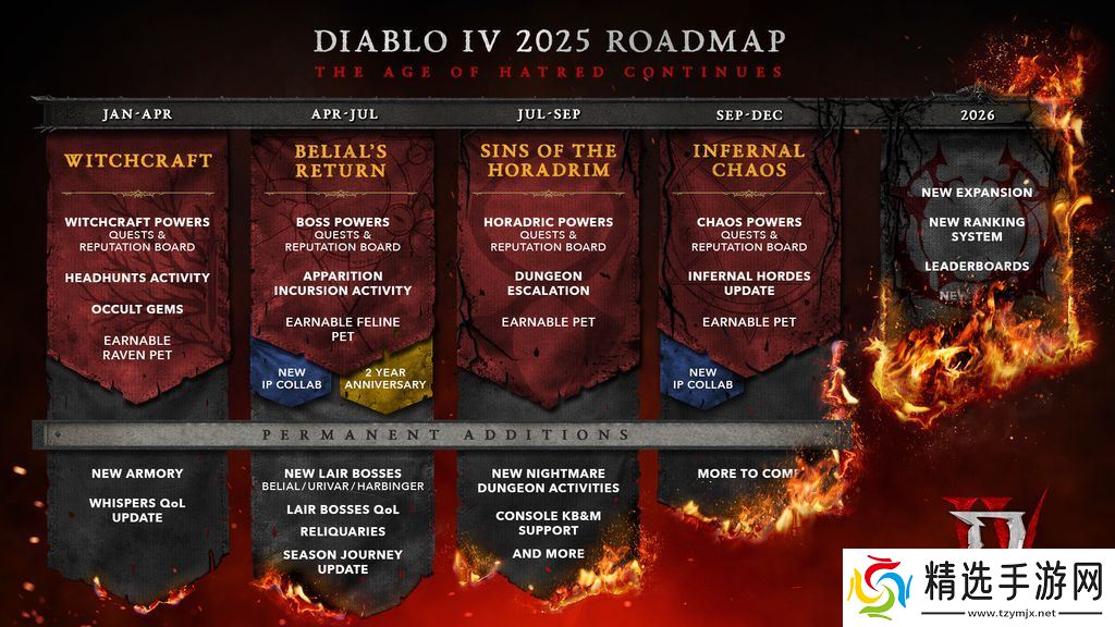 本站援引博文介绍,暴雪计划在 2025 年 4 月启动《暗黑破坏神 4》第 8 赛季,重点优化 Boss 巢穴玩法;而夏季上线的第 9 赛季将强化梦魇地下城的多样性与难度;第 10 赛季则计划翻新高人气玩法“地狱狂潮”。