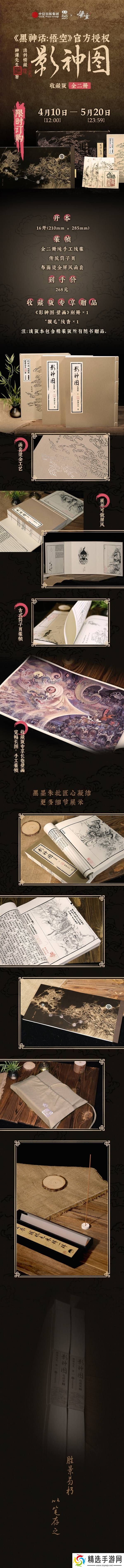 而《影神图:收藏版(全二册)》线装版则更为珍贵,采用全二册纯手工线装、传统筒子页以及布面烫金屏风函套,展现出极高的艺术品位和收藏价值。此版本限时订购时间为4月10日12点至5月20日23点59分,售价268元。除了包含精装版的所有赠品外,收藏版还额外赠送《影神图·壁画》别册和“猴毛”线香,让收藏者能够更深入地领略《影神图》的独特魅力。