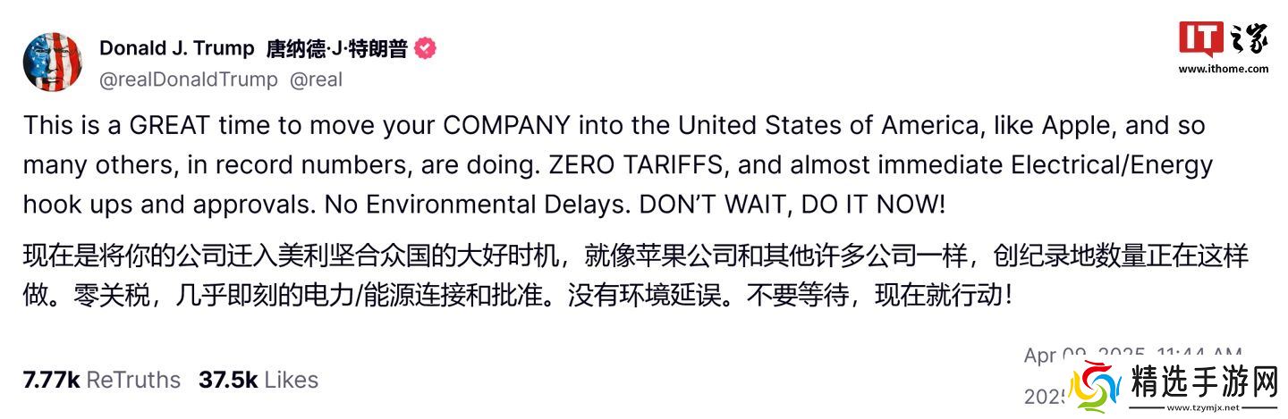 美国总统周三在 Truth Social 发文强化这一立场,称苹果等公司正以前所未有的规模迁入美国,并承诺“零关税”和快速审批。