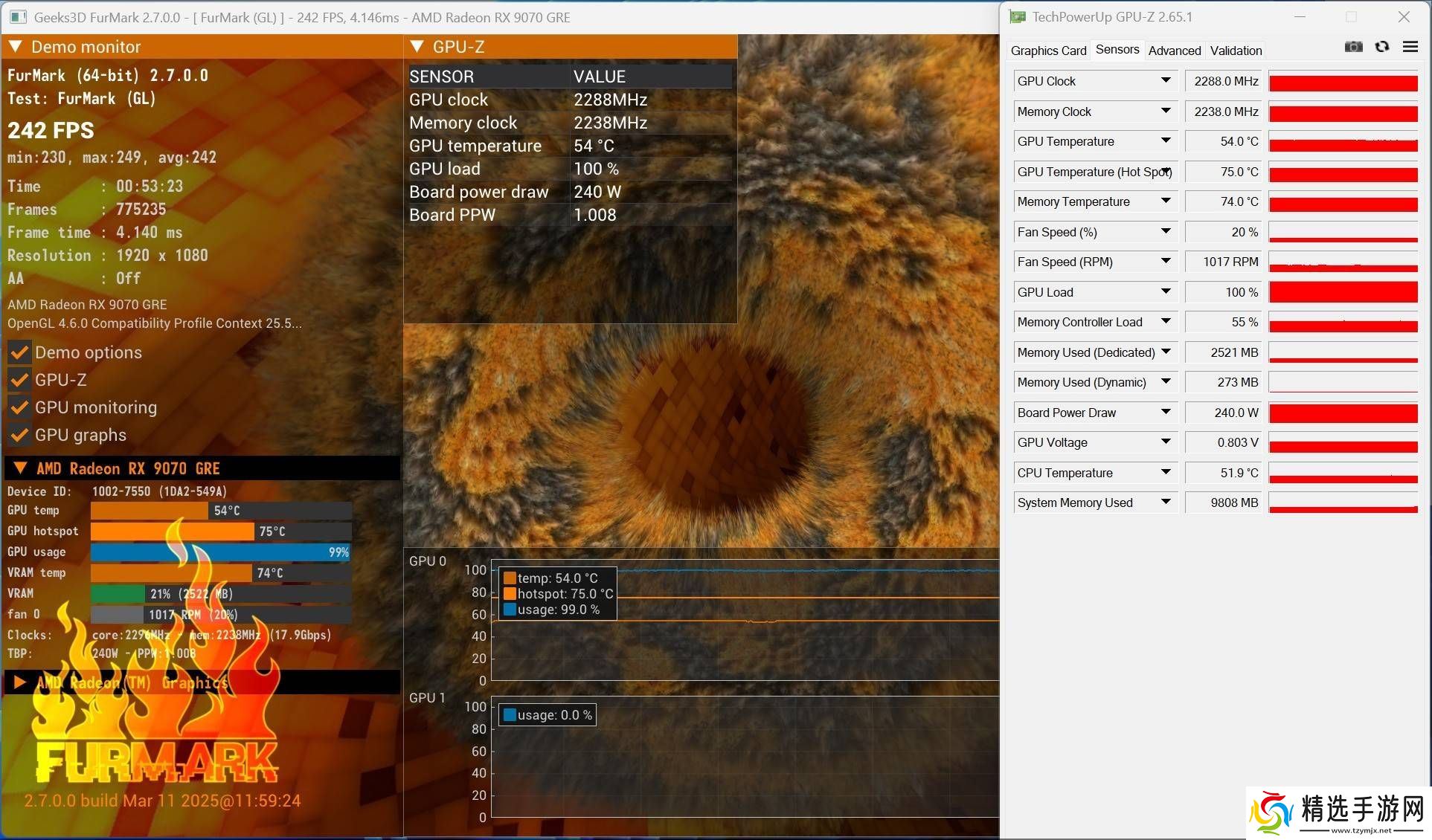 在温度及功耗测试中,蓝宝石PURE 极地 RX 9070 GRE 12G D6 OC显卡在满载拷机下温度稳定为54℃,功耗为240W。得益于其优秀的散热设计,显卡在长时间高负载下依然能保持稳定的温度和性能。