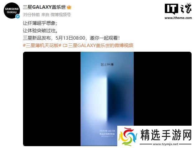 本站 5 月 8 日消息,三星今日官宣将于 5 月 13 日 8:00 举行新品发布会,“让纤薄超乎想象;让体验突破过往。”从官方 slogan 来看,本次发布会预计将带来超薄旗舰新机 Galaxy S25 Edge。