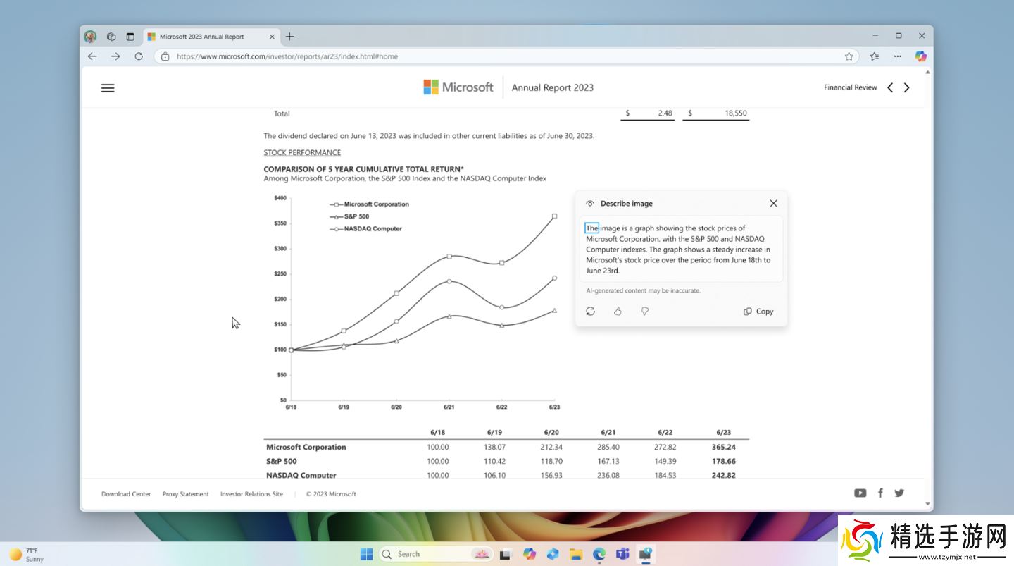 微软强化了图像描述功能(Narrator),现在 Copilot+ PC支持读出各种图片的描述,帮助障碍人群了解图片中到底有什么东西。例如对于一张展示股票表现的图表,用户将得到如下详细描述“图表展示了微软公司的股票价格,同时包含S&P 500及NASDAQ电脑指数,该图表显示从6月18日至6月23日间微软股票价格的稳步上升”。