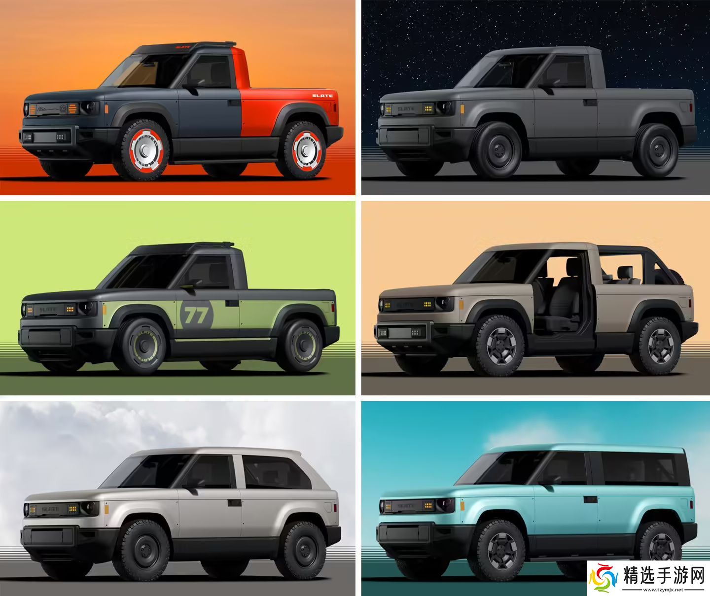 Slate 的第二个核心理念是:买得起的汽车依然可以富有吸引力。Truck 提供多种个性化选项,从鲜艳的车身涂装到不同的车轮设计,再到可选的车身样式,甚至可以通过 DIY 套件将 Truck 改装成紧凑型 SUV 或 Fastback 跨界车。