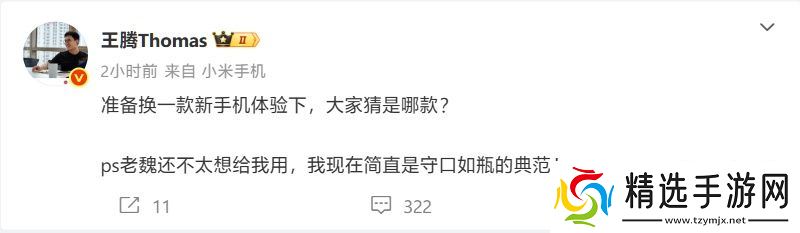 本站 5 月 10 日消息,小米中国区市场部总经理、REDMI 品牌总经理 @王腾Thomas 今日在微博发文称,准备“换一款新手机体验下”,并邀请网友猜测是哪款机型。与此同时,王腾微博的小尾巴也换成了“小米手机”。
