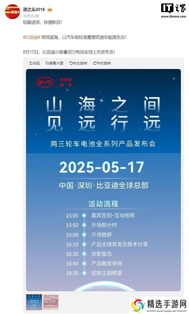 近日,网络上流传着一则关于比亚迪的重要消息,爆料者@源之头2018透露,比亚迪将于5月17日盛大召开一场关于两三轮车电池全系列产品的发布会。这一消息引起了业界的广泛关注。