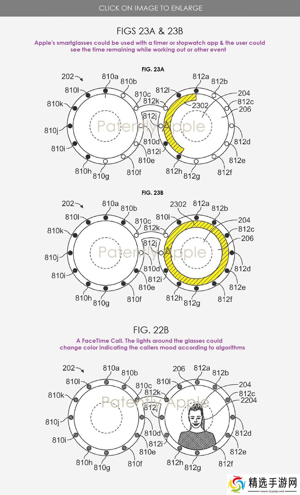此外,专利提到智能眼镜具备面部识别功能,并能根据用户姿势调整应用显示方式。例如,在 FaceTime 通话中,LED 可通过不同颜色反映对方高兴或低落等情绪,只是这一功能的实际用途尚待验证。