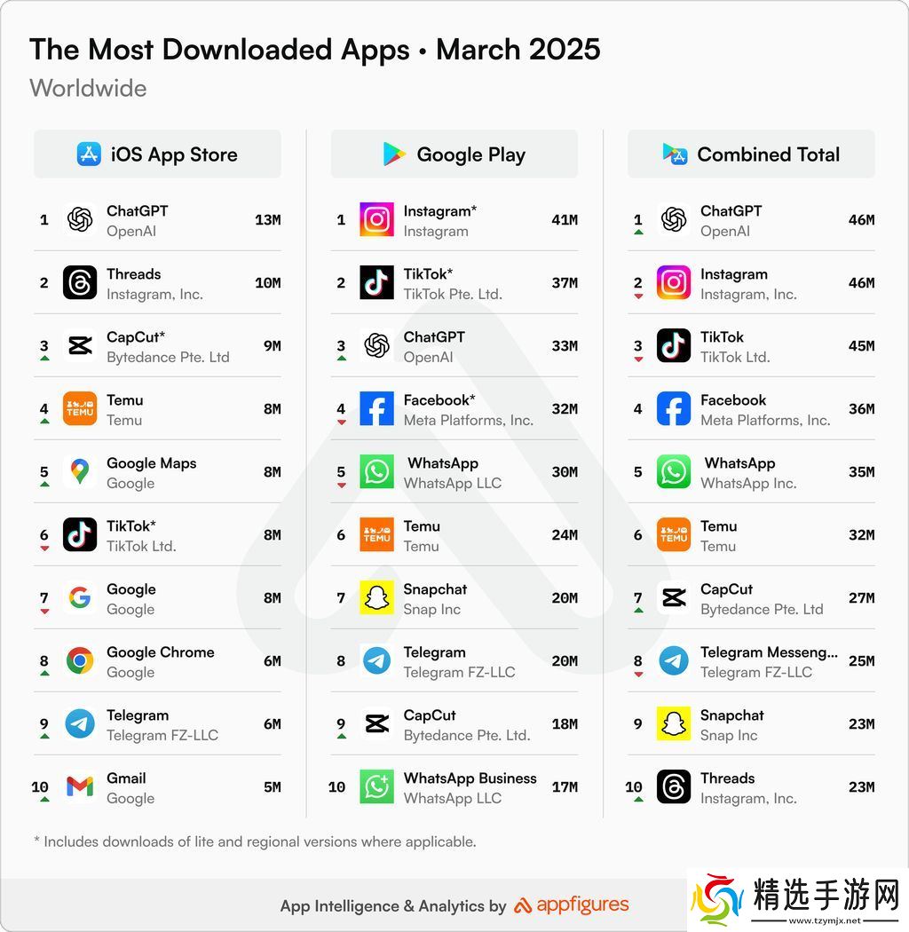 Appfigures 数据显示,2025 年 3 月,ChatGPT 以 4600 万次下载成为全球最受欢迎的非游戏类应用,超越 Instagram(4600 万次)和 TikTok(4500 万次)。