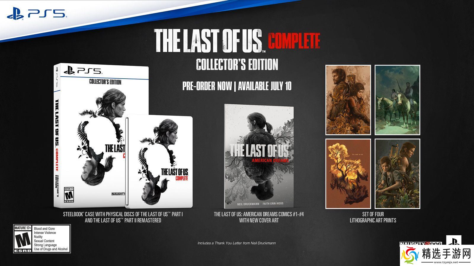 除了数字版,顽皮狗还打造了实体《The Last of Us Complete: Collector’s Edition》。该版本即日起在 direct.playstation.com 独家预订,限量发售,预计 7 月 10 日发货,售价为 110 美元(现汇率约合 809 元人民币)。