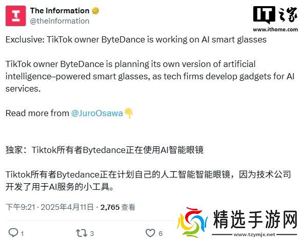 本站 4 月 11 日消息,The Information 今晚报道称,字节跳动正打算开发自家的 AI 智能眼镜类产品。一位知情人士透露,字节跳动预计将在其智能眼镜中提供类似豆包的 AI 功能。