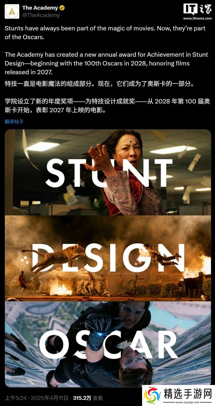 美国电影艺术与科学学院理事会今天确认,从 2028 年奥斯卡奖开始,将正式设立最佳特技设计奖(Best Stunt Design Award)。