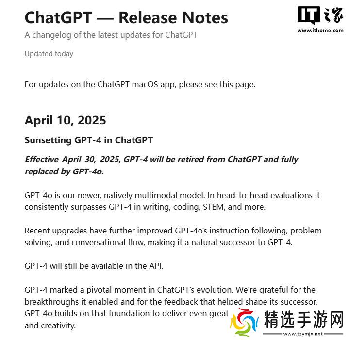 本站 4 月 11 日消息,OpenAI 宣布 GPT-4 将于 4 月 30 日从 ChatGPT中移除,但仍可在 API 中使用。OpenAI 表示,GPT-4 退役后完全由新型原生多模态模型 GPT-4o 取代。