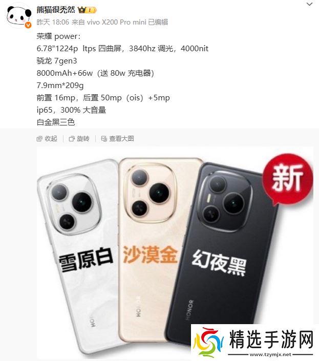 本站 4 月 12 日消息,荣耀 Power 手机将于 4 月 15 日发布,博主@熊猫很禿然 曝光了这款新机的部分参数:
