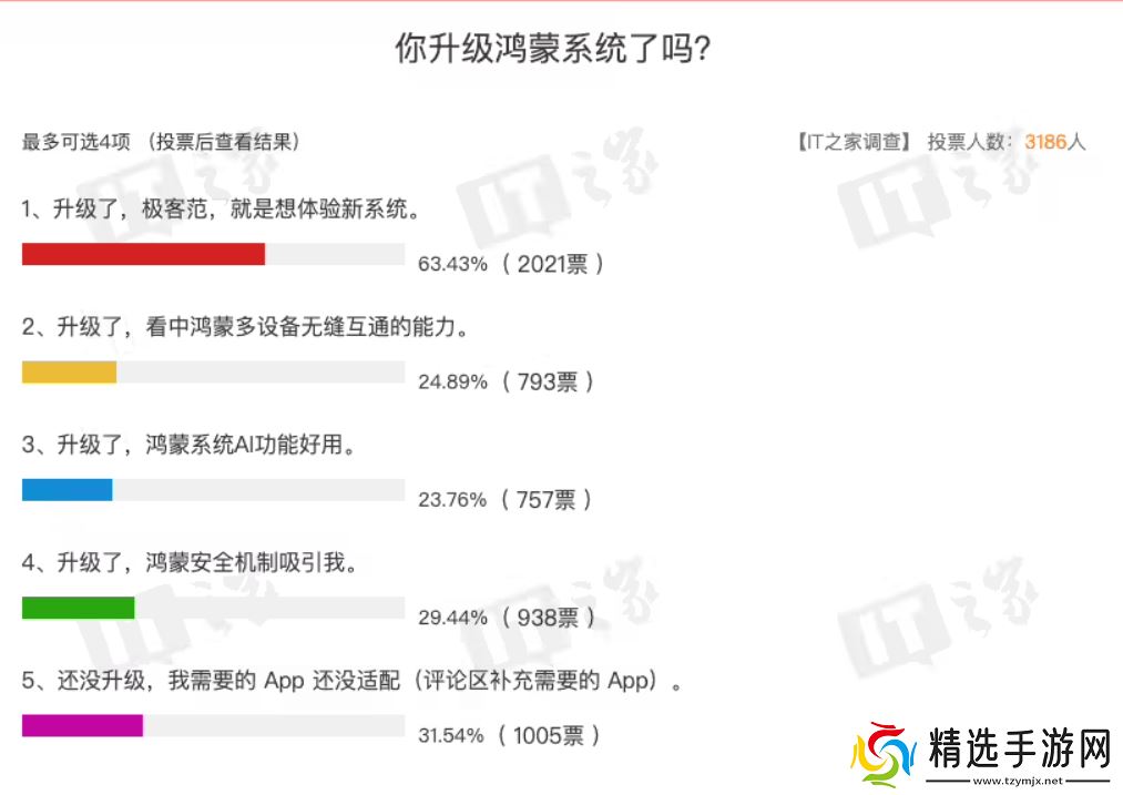针对鸿蒙 5 的升级情况,不久前本站发起了“你升级鸿蒙系统了吗?”投票,短短 1 天时间,就有 3186 人参与了投票,其中有高达 68.46% 的用户选择了“已升级”,剩下 31.54% 的用户选择了“还没升级,我需要的 App 还没适配。”