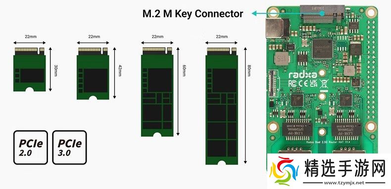 这是全球首款实现双 2.5Gbps 网口路由功能的树莓派扩展模块,并提供了 PCIe x1 插槽,支持M.22230 至 2280 四种尺寸的 NVMe 固态硬盘。