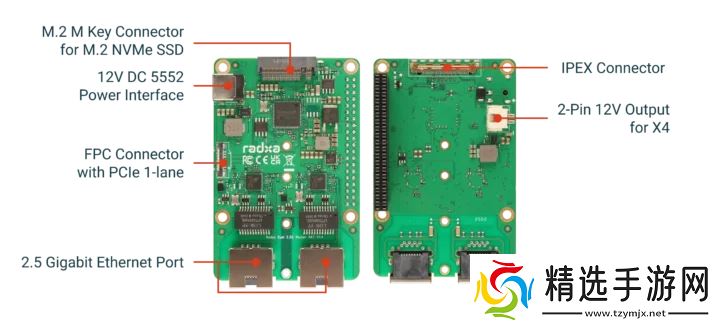 电源输出:配备 12V 双针接口,可为 Radxa X4 设备供电(需另购 IPEX 转 M.2 适配器)。