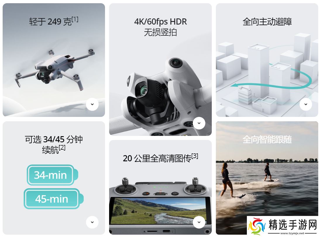 官方称,DJI Mini 4 Pro 集全面的影像实力、全向主动避障、全向智能跟随、20 公里全高清图传等性能于一身,打造 DJI Mini 系列迄今为止最全能的航拍机。