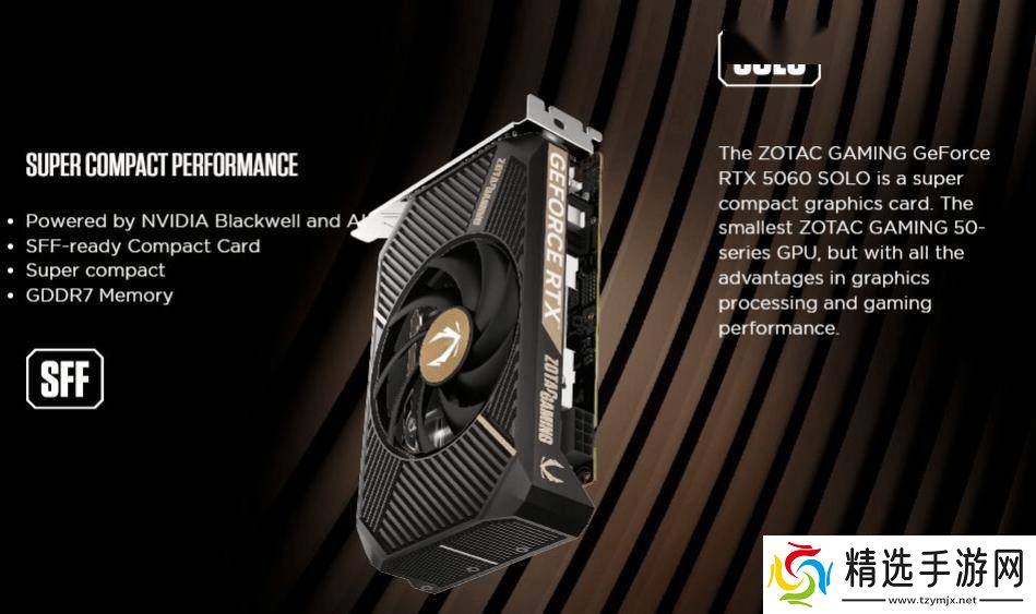 索泰作为知名的显卡制造商,近期也展示了他们的一款特别版RTX 5060显卡——RTX 5060 SOLO。这款显卡采用了单风扇设计,尺寸紧凑,非常适合ITX小型主机使用,同时也将面向全球市场发售。