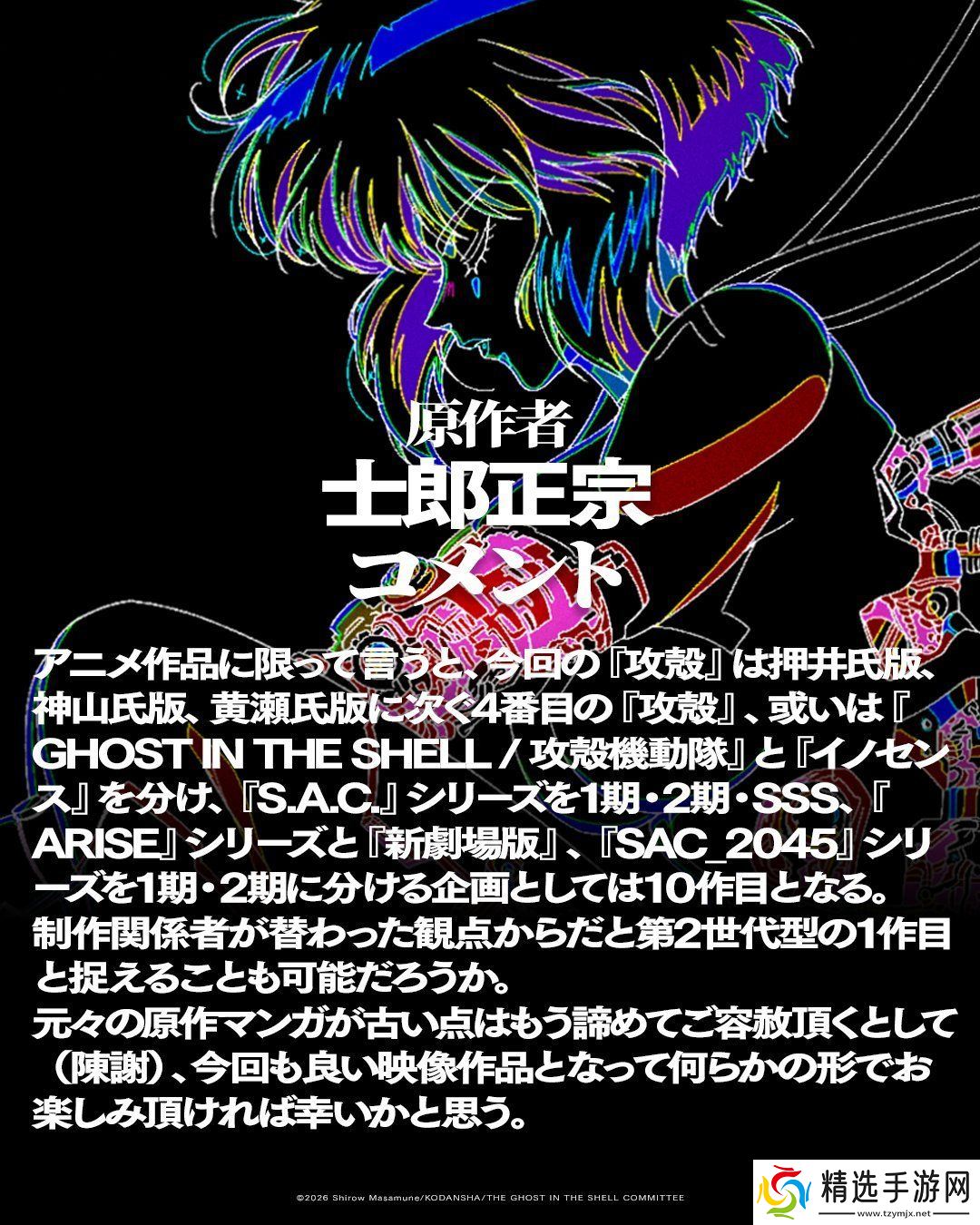 士郎正宗附言:“仅就动画作品而言,本次的《攻壳》可视为继押井守版、神山健治版、黄濑和哉版之后的第四种《攻壳》诠释,若分别计算,则本作可算作系列第十部动画企划,从制作团队更迭的角度来看,或许也可将其视为第二代团队的首部作品,原作漫画年代久远之处还望海涵,惟愿本次影像作品能呈现优质内容,以某种形式为观众带来愉悦体验。”