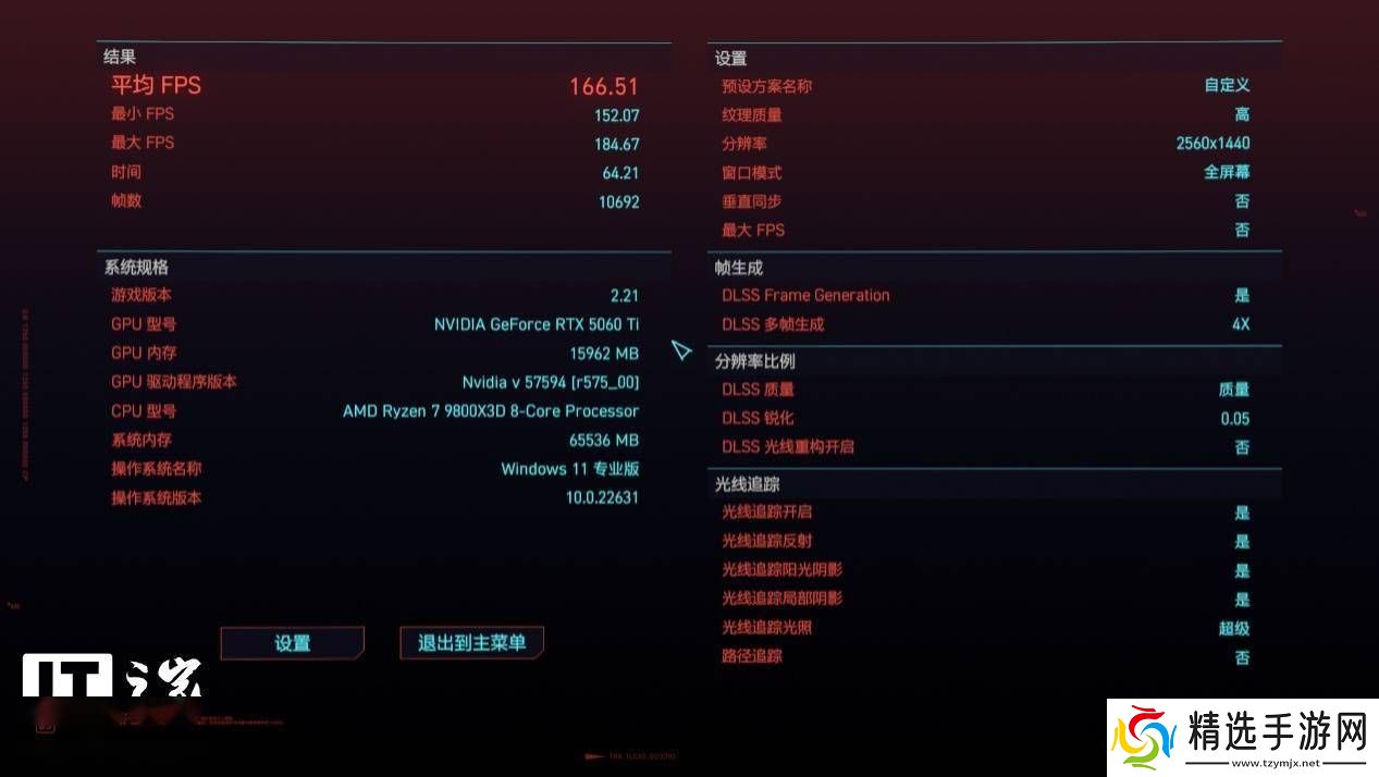 特别在支持DLSS 4多帧生成技术的游戏中,RTX 5060 Ti的表现更是令人惊艳。在《永劫无间》中,开启DLSS 4多帧生成后,游戏平均帧数从不开启时的151帧提升到了188帧。在《赛博朋克:2077》中,开启多帧生成后,游戏平均帧数从57帧提升到了166帧。这些测试结果表明,DLSS 4多帧生成技术为游戏性能带来了巨大的提升。