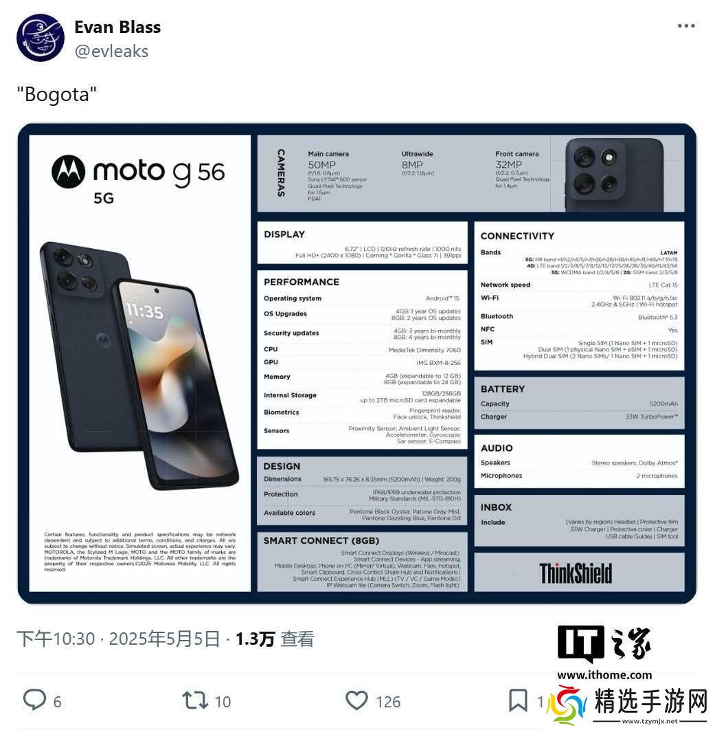 续航方面,该手机配备了5200mAh的大容量电池,并支持33W快充技术,确保用户长时间使用的需求。系统方面,Moto G56 5G预装了基于安卓15的Hello UI,基础版本提供1年系统更新和3年安全补丁,高配版则提供2次系统更新和4年安全补丁,保障用户的使用安全。