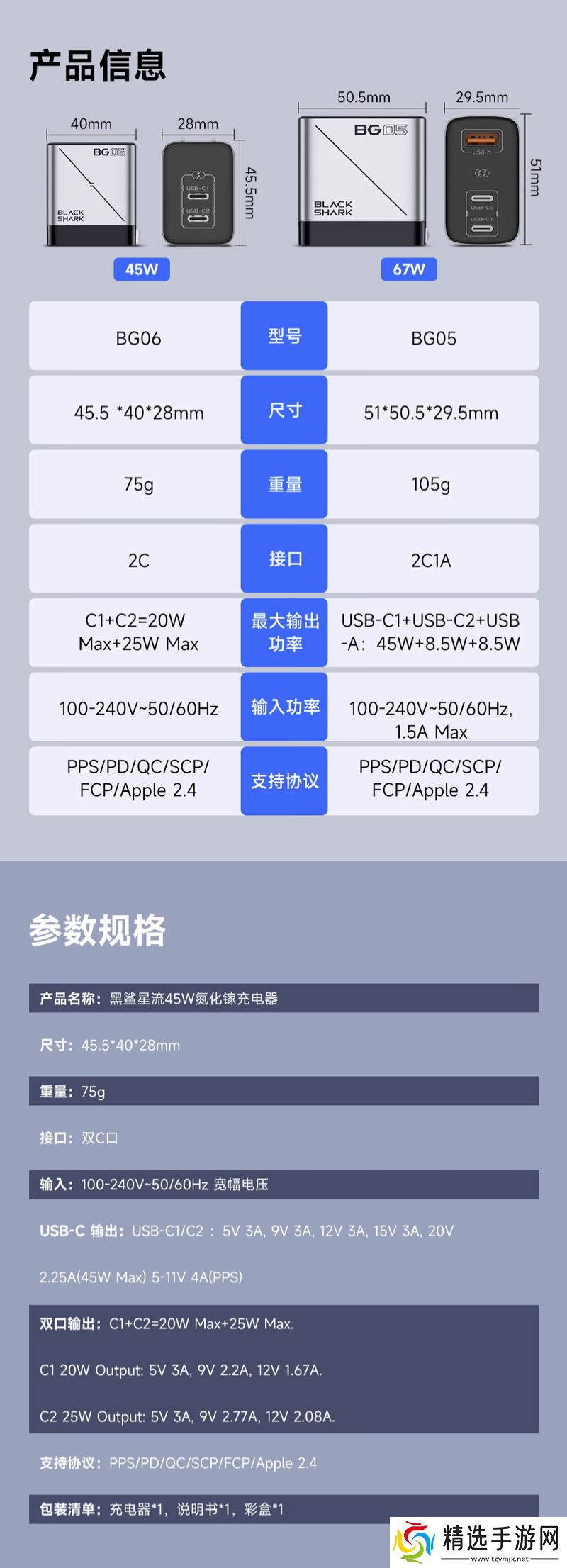 这款充电头采用银灰色外观设计,提供可折叠插脚,整体尺寸为 45.5 x 40 x 28mm,重量 75 克。从充电头采用双USB-C设计,单口输出功率45W,支持PPS、PD、QC、SCP、SFC、Apple 2.4等协议。