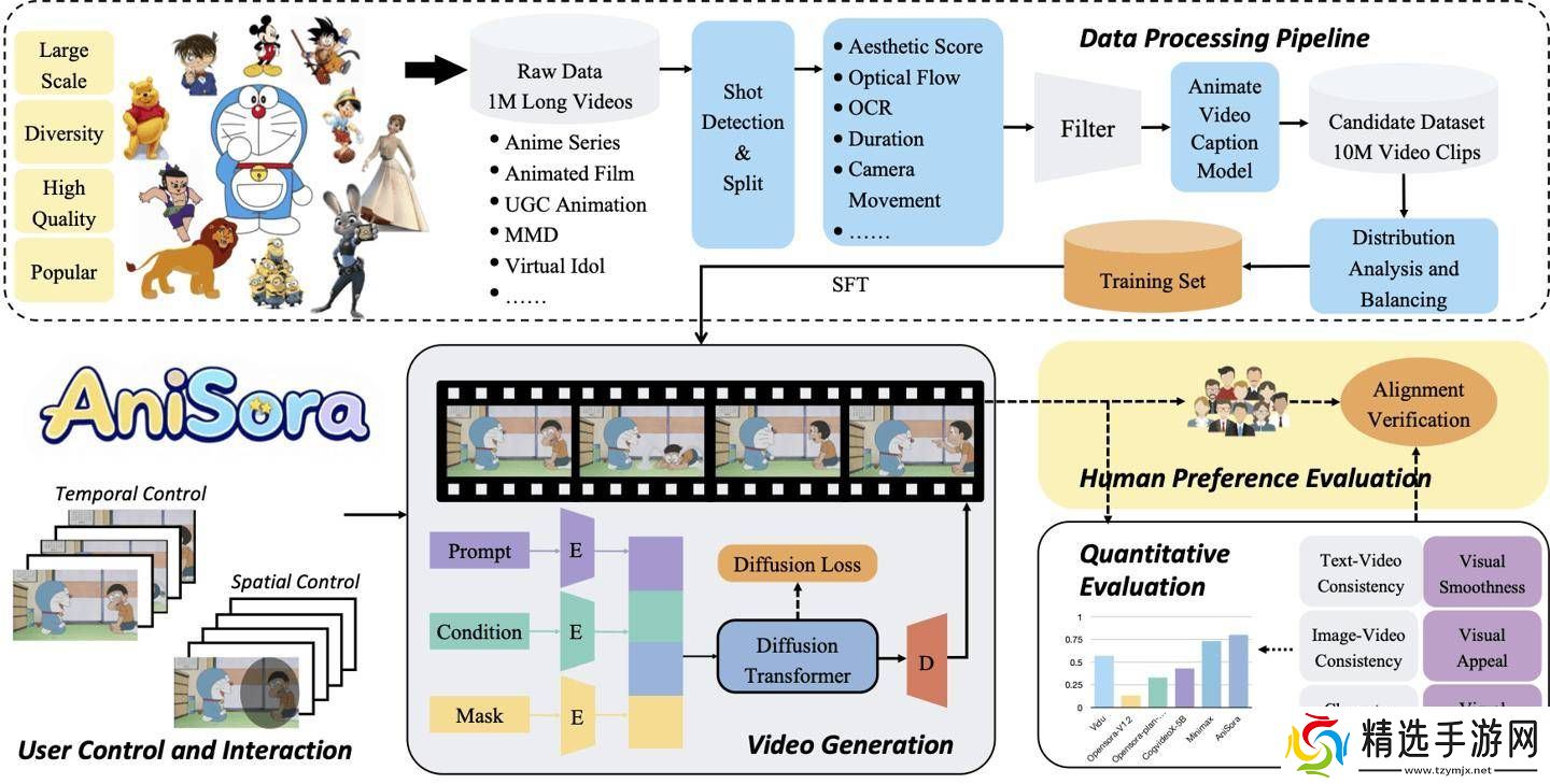 为了克服这些挑战,B站团队精心打造了AniSora系统。该系统涵盖了数据处理流水线、可控生成模型以及评测数据集等多个方面。其中,数据处理流水线整合了超过1000万份高质量数据,为模型的训练提供了坚实的基础。可控生成模型则引入了时空掩码模块,支持图生视频、帧插值、局部图像引导等关键动画制作功能,使得生成的动漫视频更加生动和逼真。