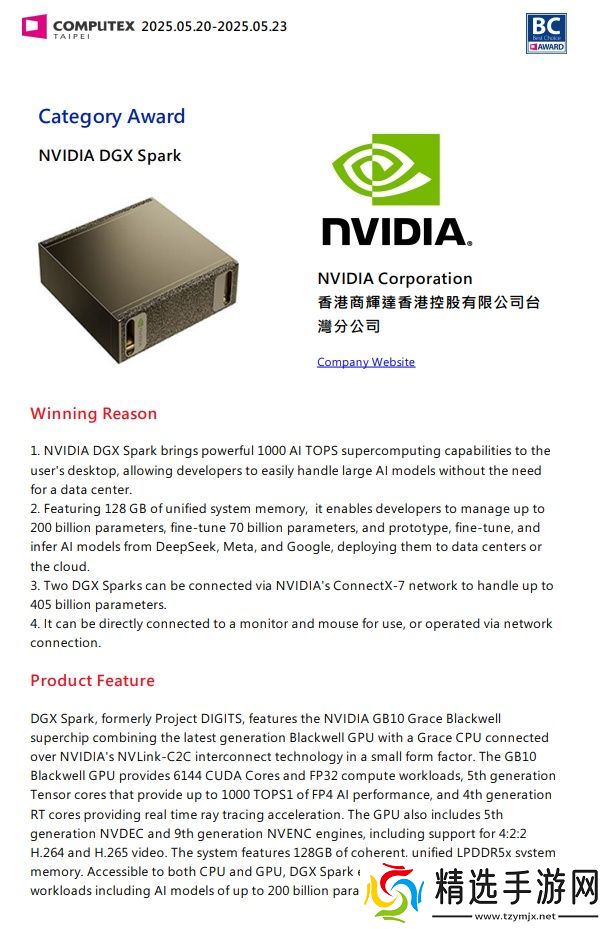 本站 5 月 18 日消息,在 Computex 2025 台北国际电脑展开幕前夕,各家参展公司纷纷炫耀其最新奖项。巧的是,Computex“最佳选择奖”页面意外曝光了英伟达未曾公布 GB10 超级芯片规格。