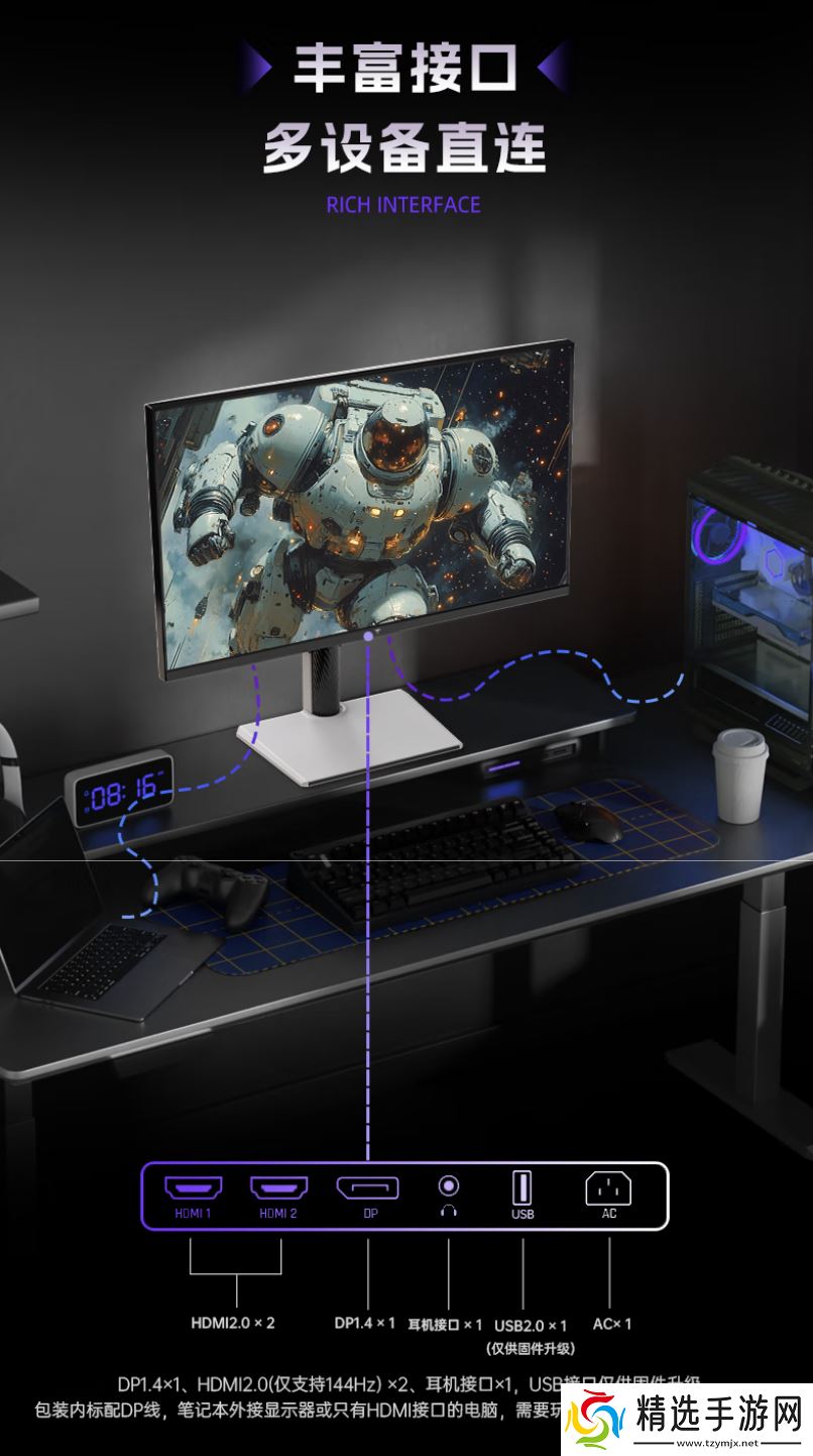 这款显示器配备一块2560x1440分辨率 1152分区原生200Hz Mini LED面板,显示器响应速度2ms,亮度至高1000尼特,静态对比度1000:1,支持10-Bit色彩(8-Bit + FRC)。