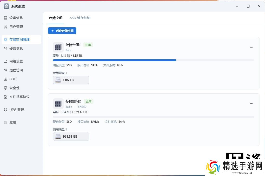 随后,我们可以通过系统设置中的“存储空间管理”功能创建存储池,支持多种模式和 RAID 选项,例如将单块硬盘拆分成多个存储空间,或者将多个硬盘合并创建为一个存储分区。