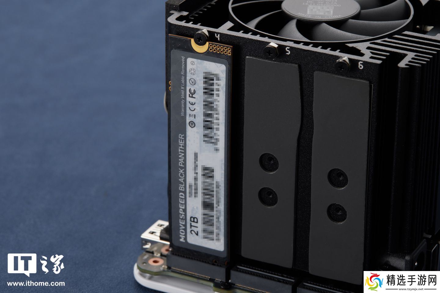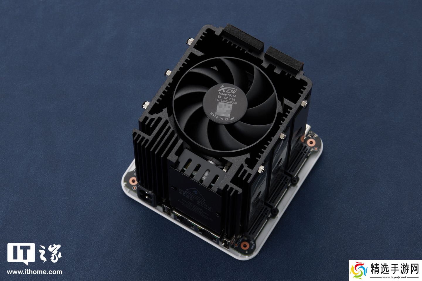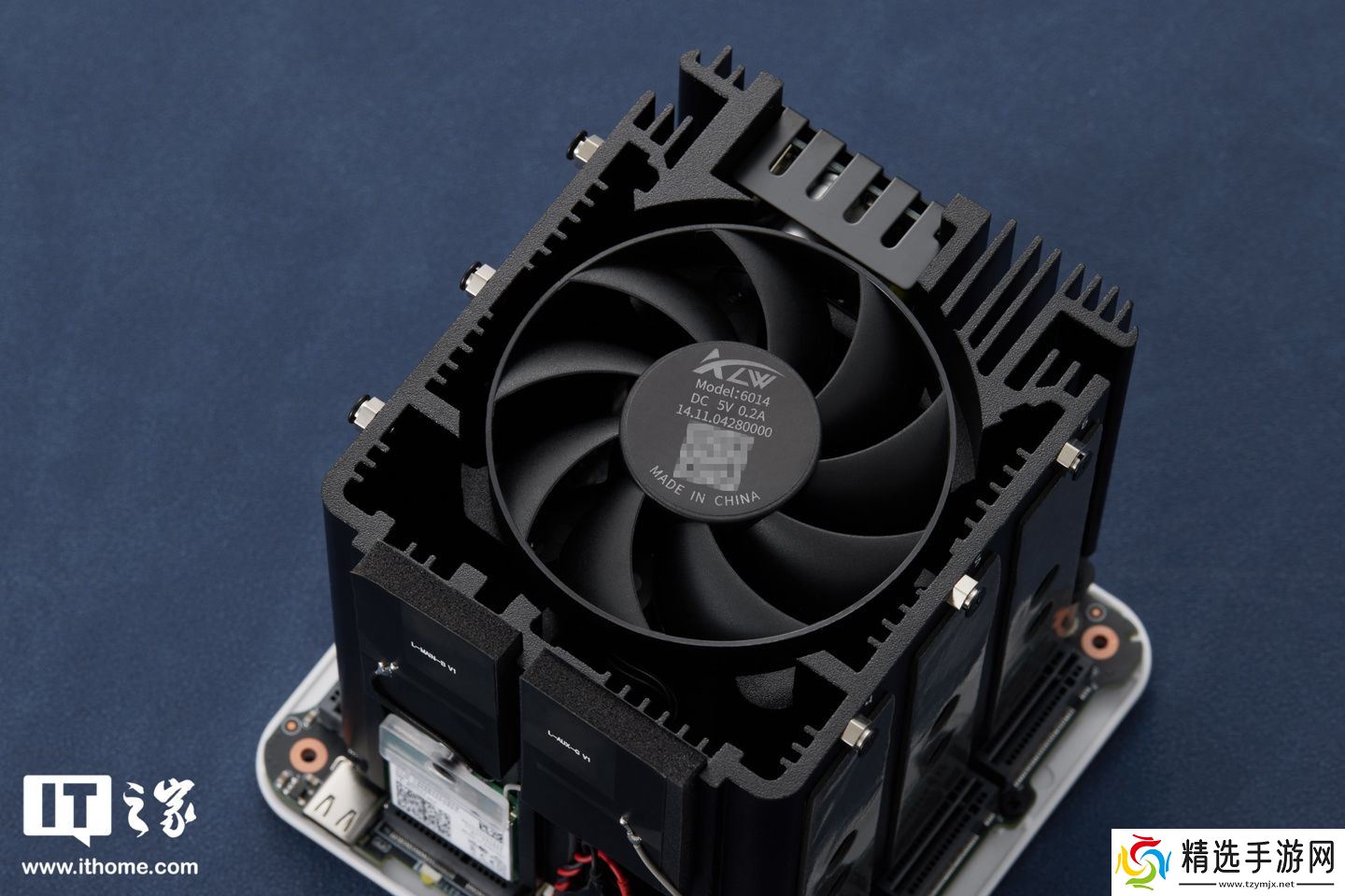 其顶部采用了一颗 6cm 的散热风扇(平均转速 1500rpm),向下向内直吹 CPU;且散热风扇四周一整圈都是铝合金散热鳍片,厚约 2.5~4.5mm,可帮助周围一圈 M.2 固态硬盘共同实现散热效果。