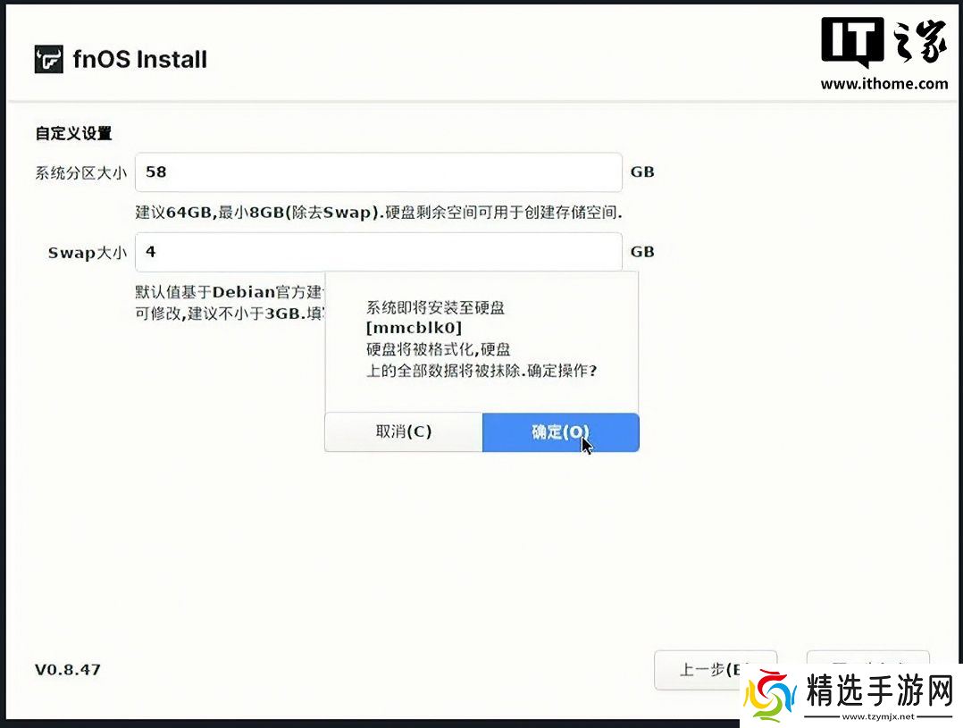 此时,我们可以使用方向键选择要用于系统安装的硬盘,也就是 ME mini 自带的 64GB eMMC 存储,然后设置系统分区及 Swap 大小(默认即可),确认格式化并完成安装。