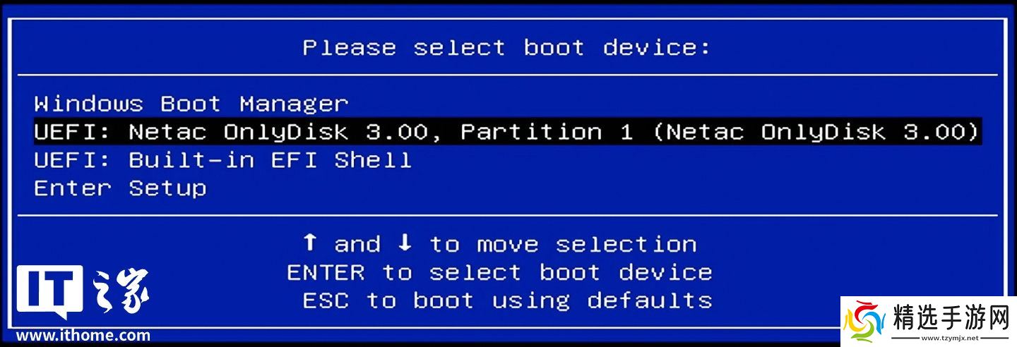 对于 ME mini 来说,我们可以在开机时按下键盘上的 F7 按键进入 Boot 选择界面,当然你也可以按 Del 键进入 BIOS 找到对应的启动项。这里选择刚刚制作的启动盘即可。
