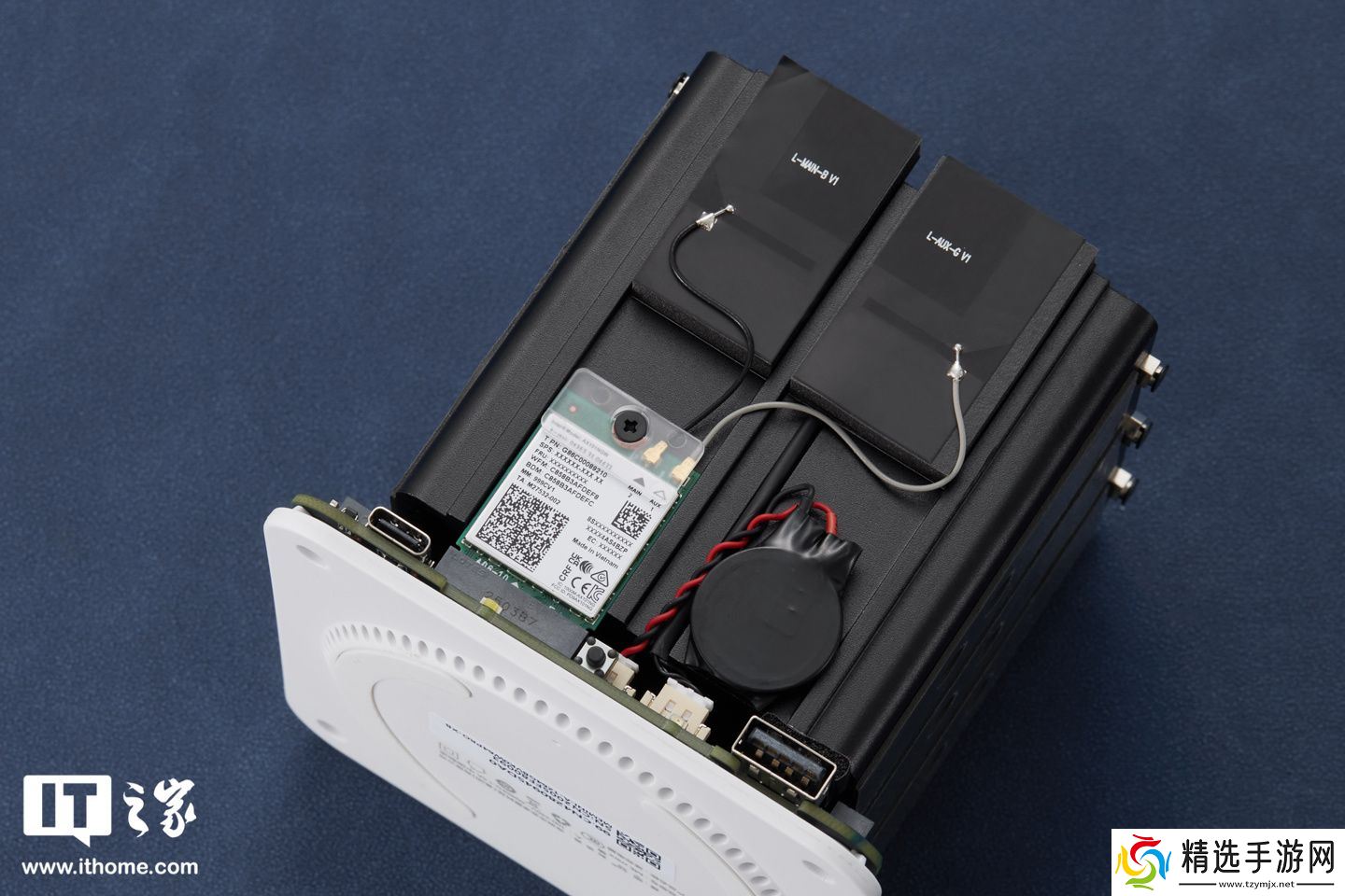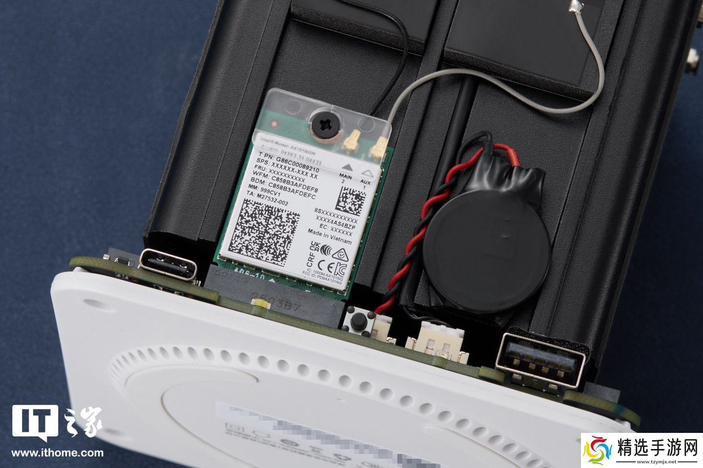 我们继续再看另一面,零刻 ME mini 正面明显可见原装 Intel AX101 无线网卡,同样采用立式 M.2 2230 插槽;且 WiFi、蓝牙天线模块及主板电池也位于这一面,天线模块面向塑料机壳,有效避免电磁屏蔽干扰信号。