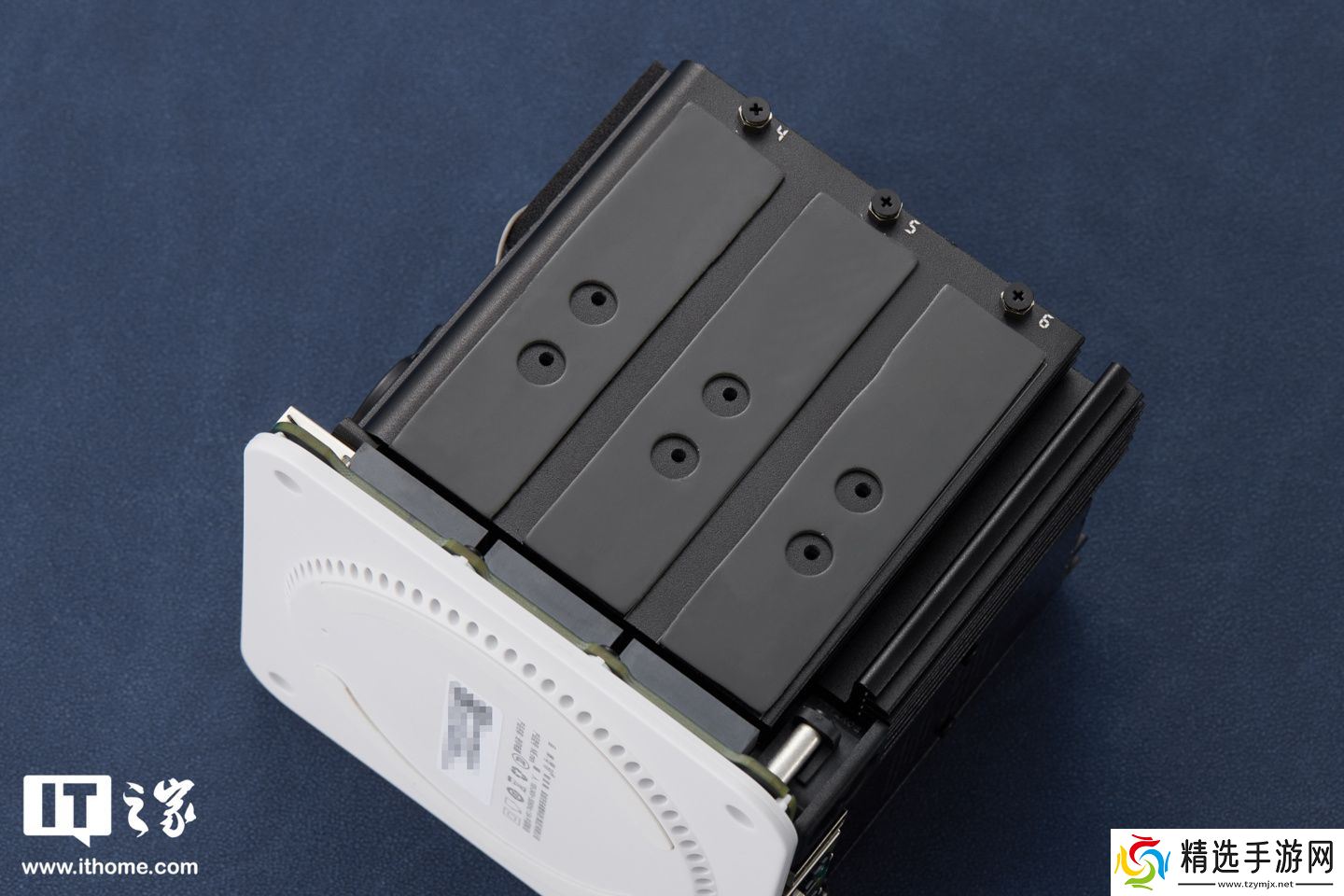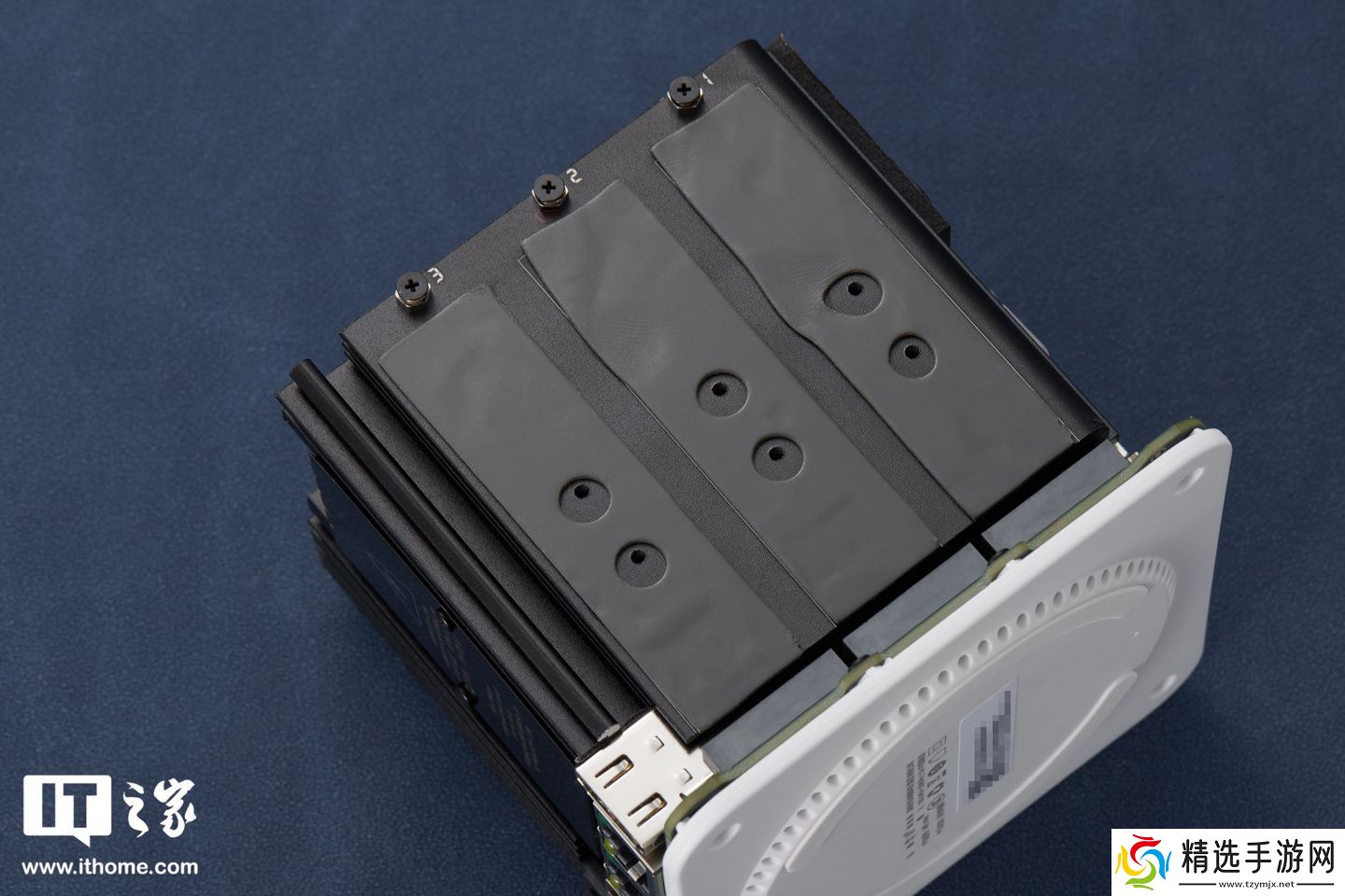 我们可以看到,其内部采用了模块化金属框架,包括主板 / 存储 / 散热三明治结构,六个 M.2 硬盘插槽(兼容 2230/2242/2280)位于机身两侧,默认预装了六个导热垫(导热垫未覆贴膜,NAND 闪存芯片应贴合内侧散热鳍片方向),且分别标注有 123、456,在细节方面做得非常不错。