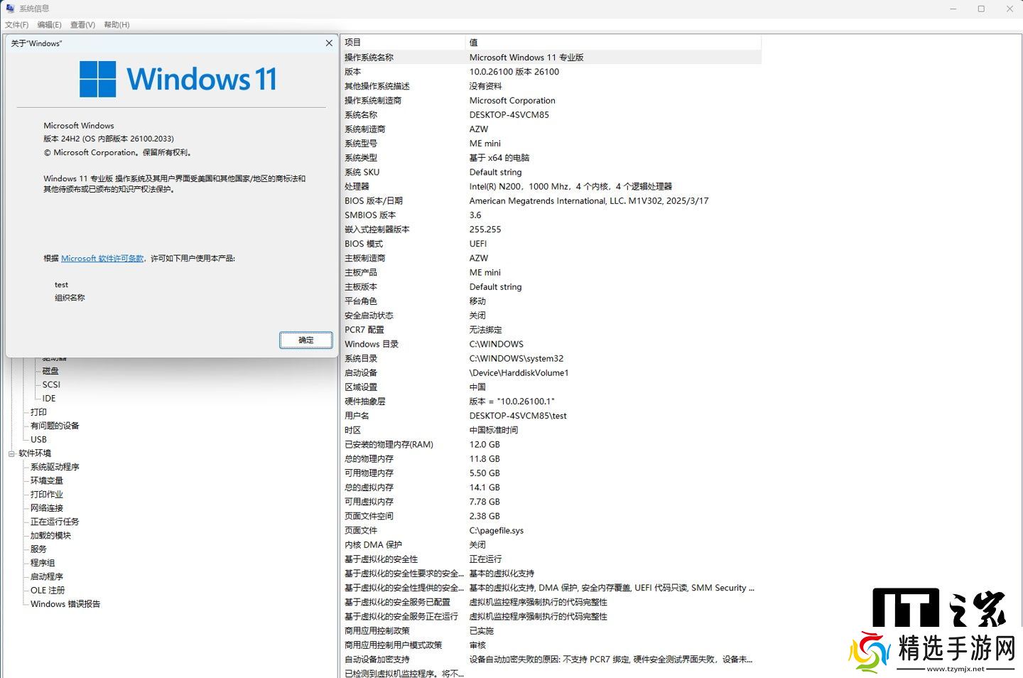 这款小主机内置了 64GB 的 eMMC 存储,开箱预装正版 Windows11 专业版(24H2)系统,开机联网即可自动激活,比较适合轻办公类用户使用。