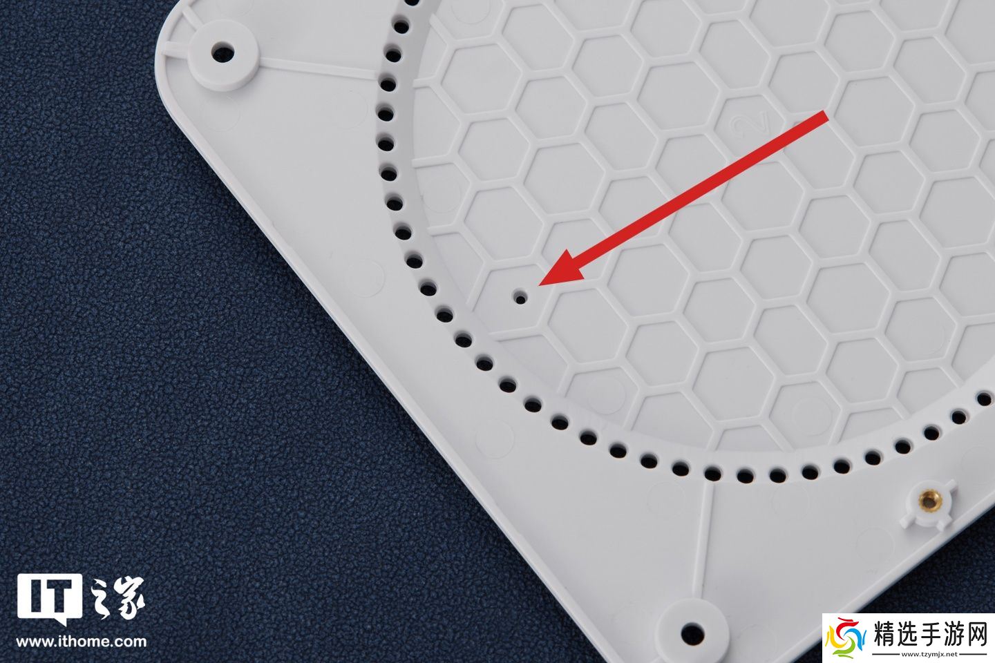 拆下四颗固定螺丝,我们就可以轻松拆下机身底板,在其中我们还可以看到一圈散热小孔,并且中间还隐藏了一个神秘小孔(可以透过小孔按下主板上的BIOS复位键)。