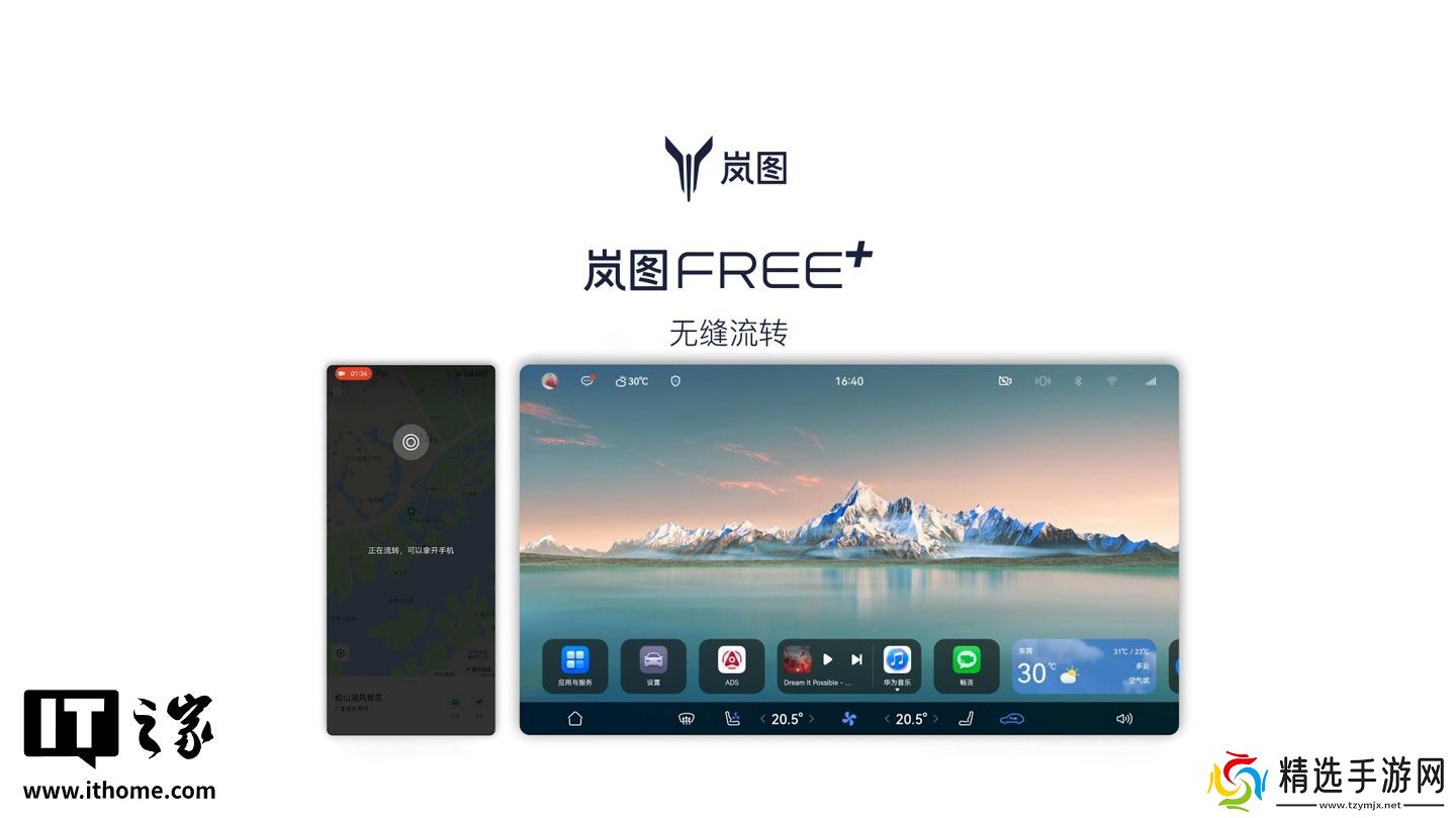 据介绍,岚图 FREE+ 汽车所搭载的鸿蒙座舱 5 支持全场景无缝任务流转,可让导航、音乐、畅连等在手机与车机之间自然接续、无缝流转(支持一碰传、自动流转)。例如:导航流转支持手机应用上的地址一碰流转到车机进行导航;音乐流转支持上车后,手机上播放的音乐自动流转到车机上。