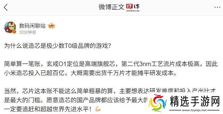 知名数码博主@数码闲聊站也发表了关于“玄戒”的最新动态,指出“玄戒O1”定位高端旗舰芯片,采用第二代3nm工艺制造,其高昂的流片成本是导致小米在该项目上投入超百亿的原因之一。据分析,小米需要售出约千万片“玄戒O1”芯片,才能有效摊平其研发成本。