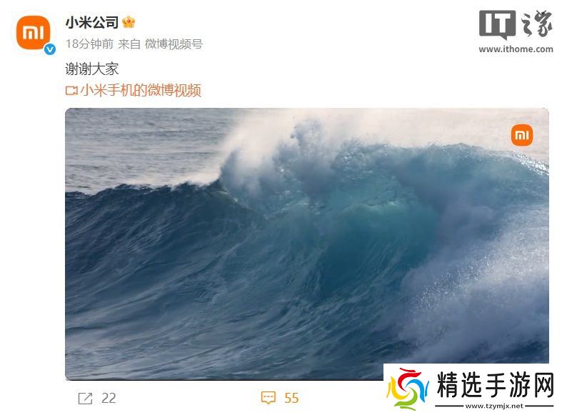本站 5 月 19 日消息,今日早间,小米公司、小米手机、小米汽车等多个账号发布了一段海浪的视频,并配文“谢谢大家”。