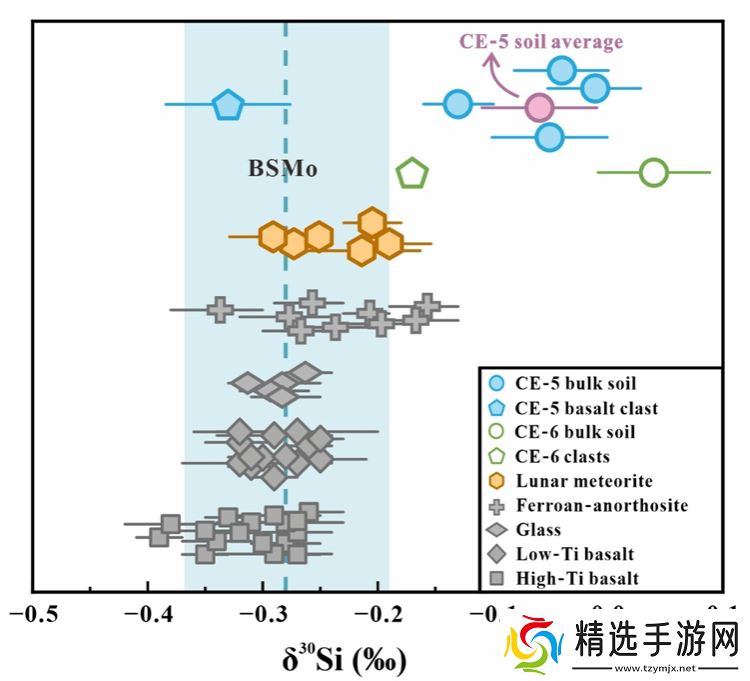 研究结果显示,嫦娥五号带回的月壤样品中硅同位素的δ30Si平均值为-0.06±0.05‰,而嫦娥六号带回的月壤样品则为0.04±0.05‰。这两个值均高于全硅酸盐月球的硅同位素组成(-0.29±0.08‰)。值得注意的是,嫦娥五号岩屑的硅同位素组成与全硅酸盐月球相近,而嫦娥六号岩屑的硅同位素组成则略重。