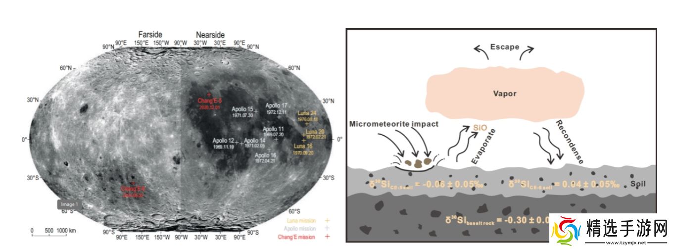 研究团队认为,这些差异可能与太空风化作用中的微陨石撞击过程有关。高速运动的微陨石撞击月球表面,导致表层物质局部熔融,硅以SiO的形式挥发。在这个过程中,轻硅同位素更容易进入气相,使得残余熔体中富集较重的硅同位素。挥发的蒸汽可能逃逸后再沉积回月表,从而导致月壤物质的硅同位素与原始玄武岩之间产生分馏。