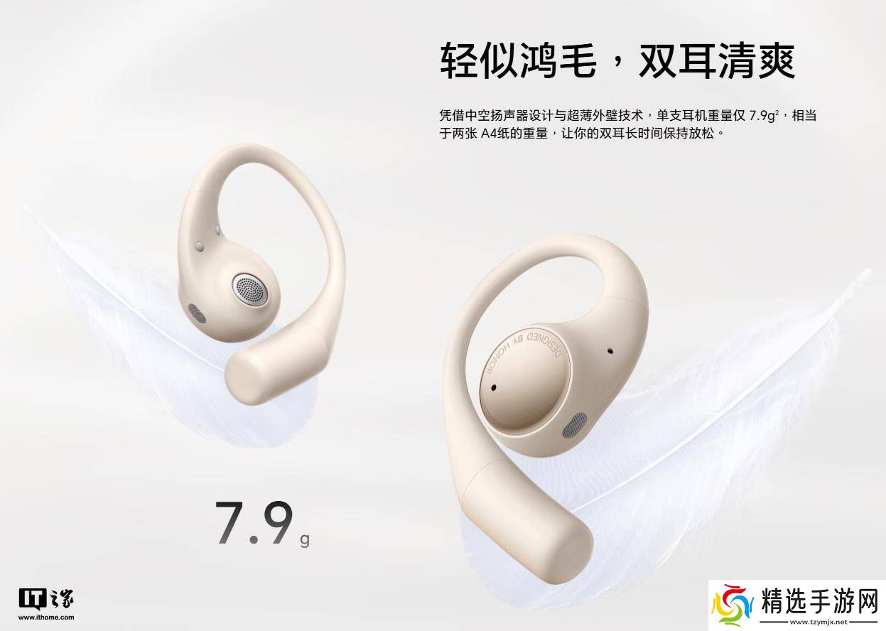 荣耀Earbuds Open耳机采用了独特的弯月形设计与人体工学原理相结合,单个耳机的重量仅为7.9克。其表面覆盖有食品级硅胶材质,C型桥部分则选用了镍钛记忆合金,旨在提供长时间佩戴的舒适度。