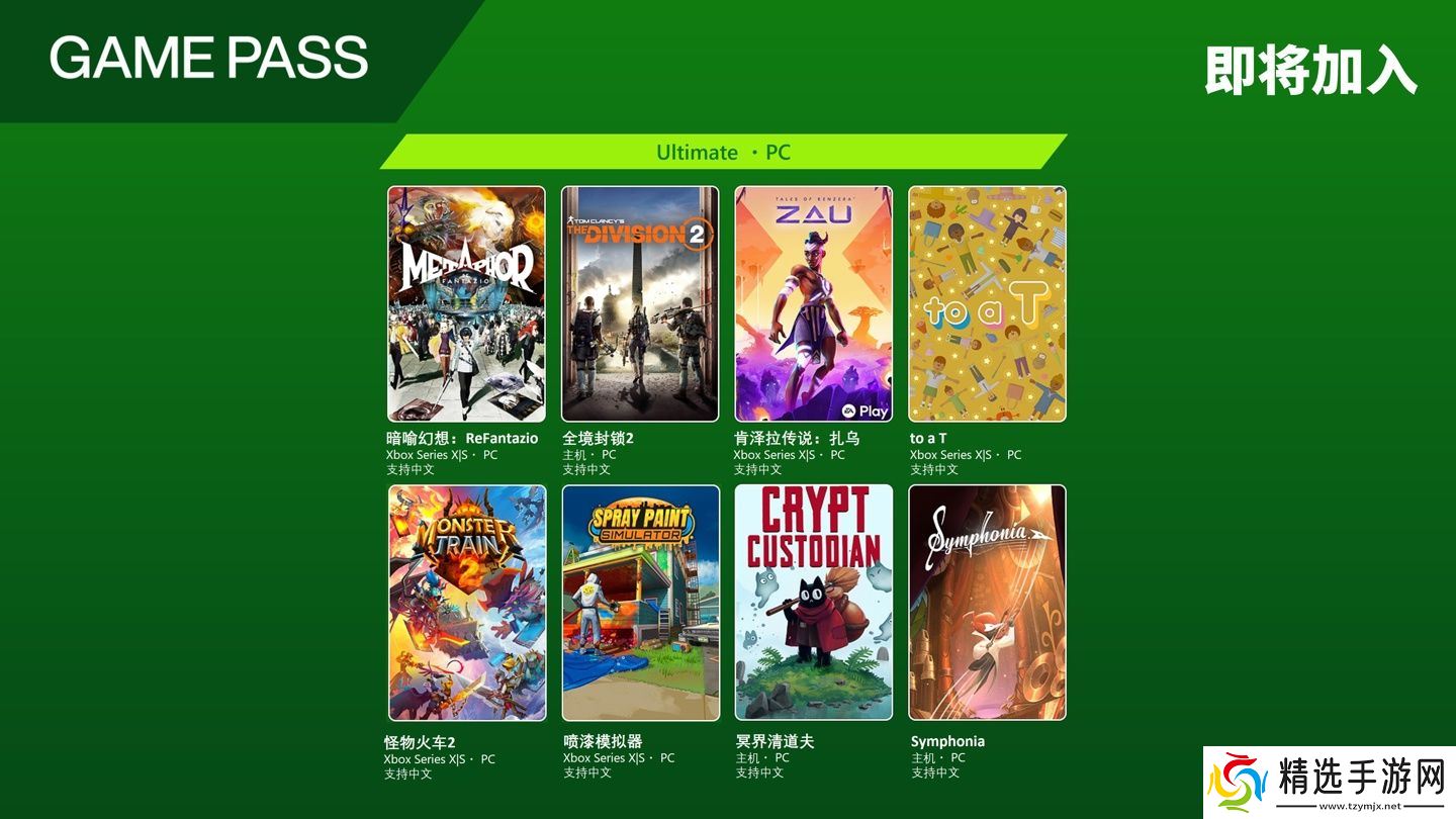 本站 5 月 21 日消息,微软 Xbox 官微今日宣布,《暗喻幻想:ReFantazio》《全境封锁 2》《肯泽拉传说:扎乌》《to a T》《怪物火车 2》《喷漆模拟器》《冥界清道夫》《Symphonia》即将加入 Game Pass Ultimate・PC。