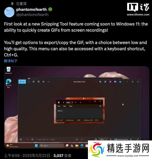 本站 5 月 23 日消息,消息源 phantomofearth 今日于 X 平台上发文,展示了 Windows 11 截图工具即将推出的新功能:录屏可保存为 GIF 动图。