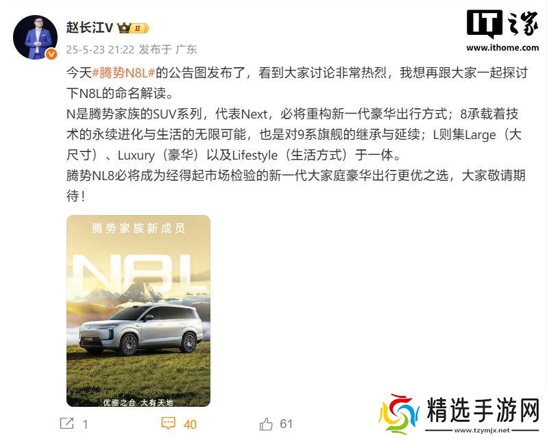 本站 5 月 23 日消息,在腾势 N8L 的“工信部证件照”公布后,比亚迪腾势销售事业部总经理赵长江今日发文称,跟大家一起探讨下 N8L 的命名解读。