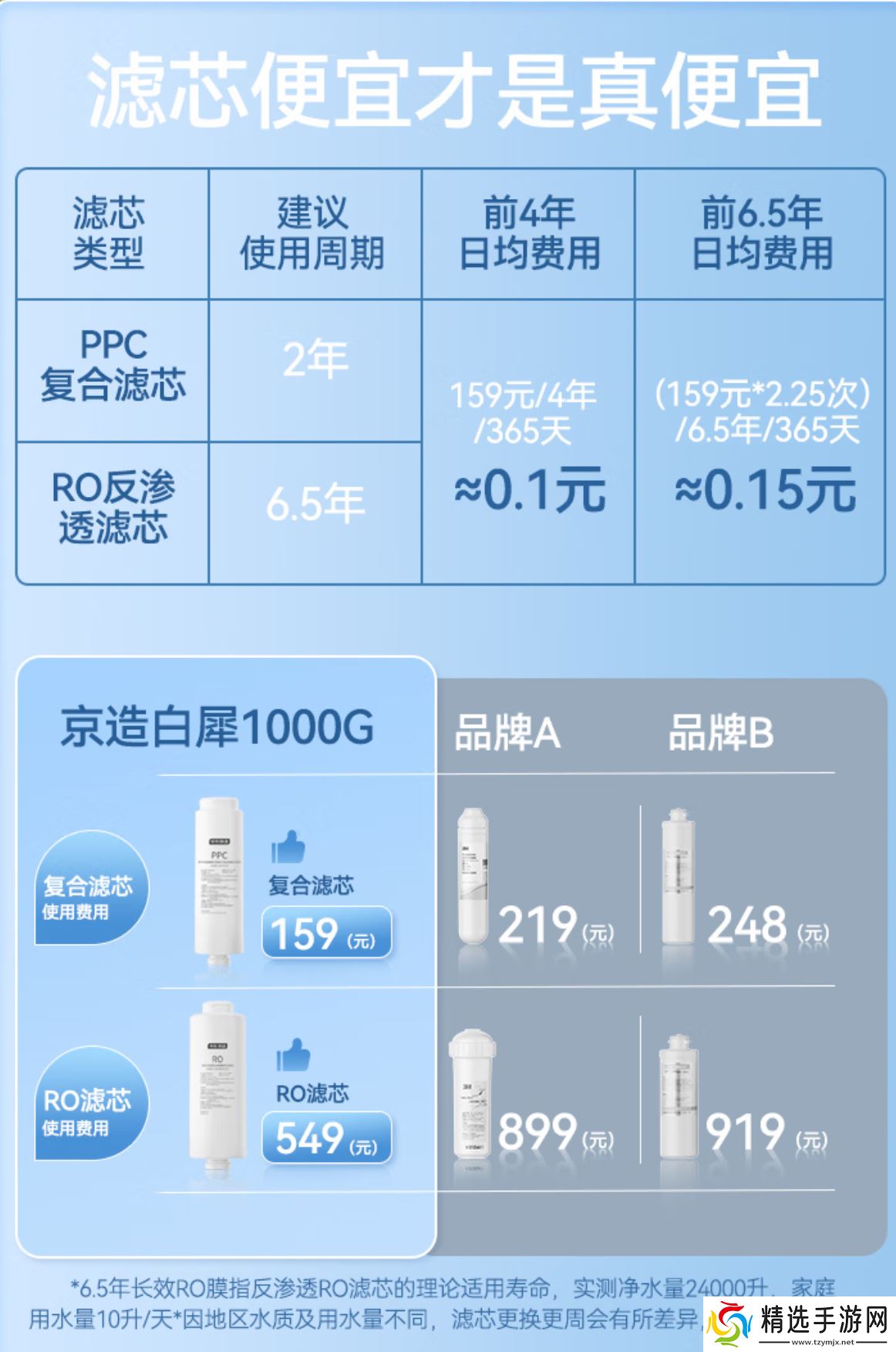 官方宣称“6.5 年 RO 反渗透滤芯”,总净水量提升至 24000L 以上:
