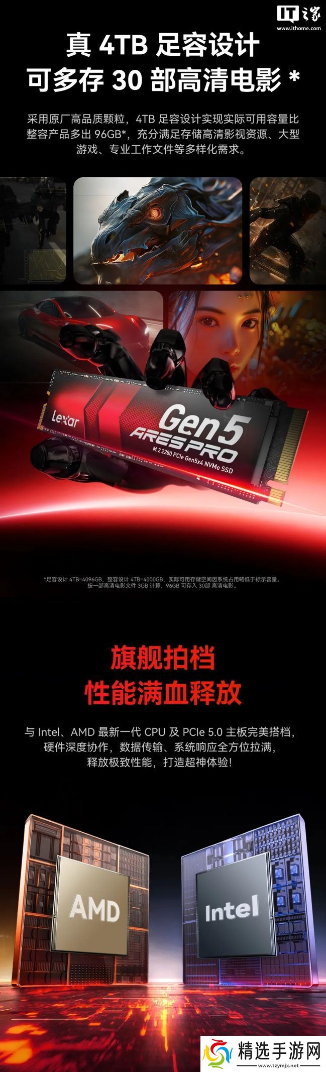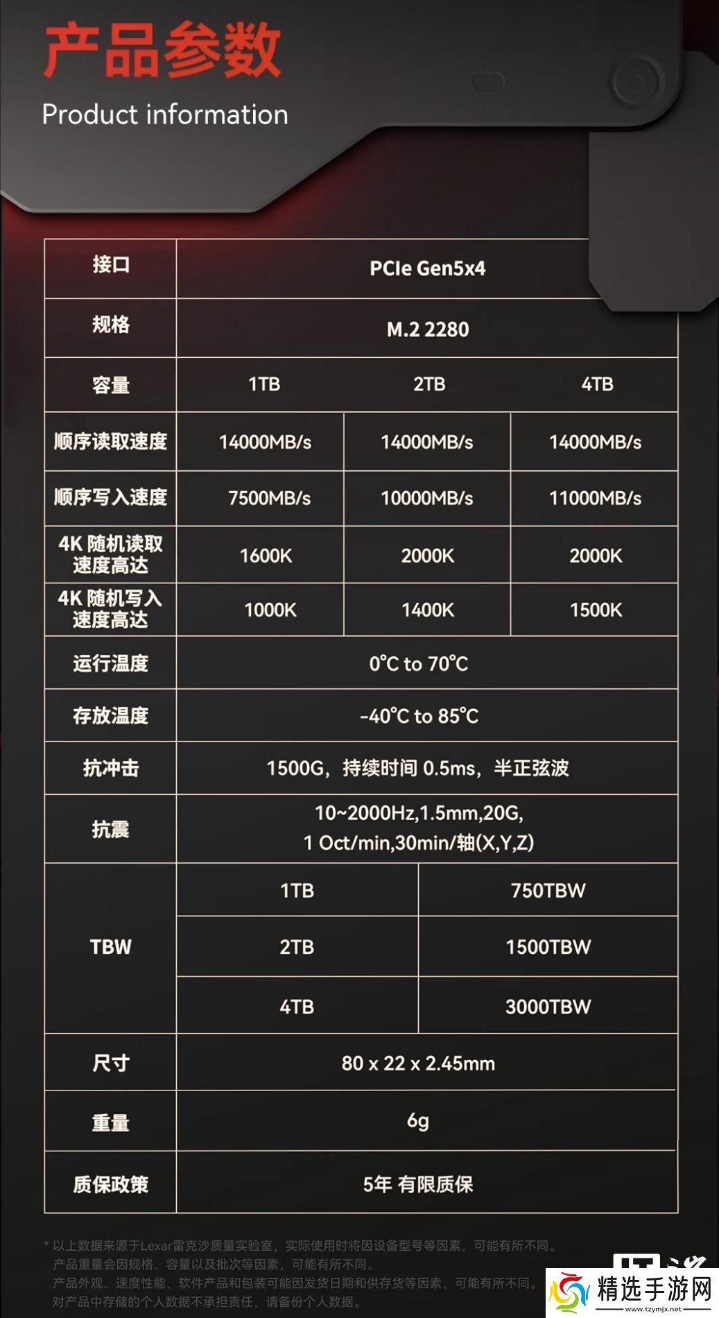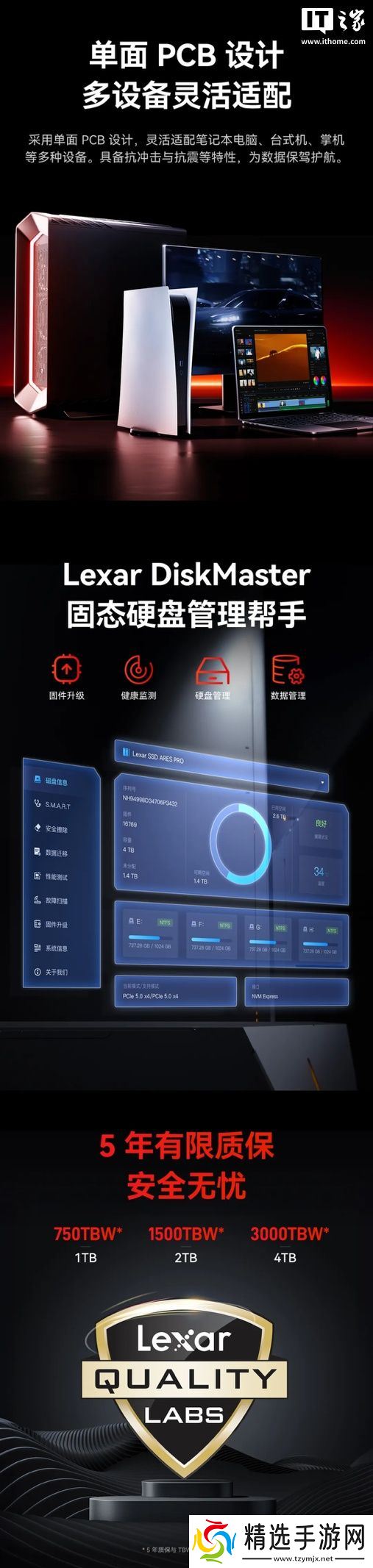 产品还支持微软 DirectStorage 技术,采用 4TB 足容和单面 PCB 设计,配有 Lexar DiskMaster 固态硬盘管理助手,并提供 5 年质保。